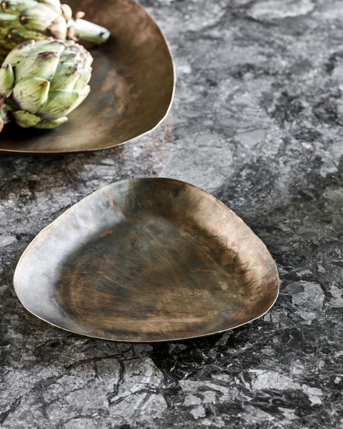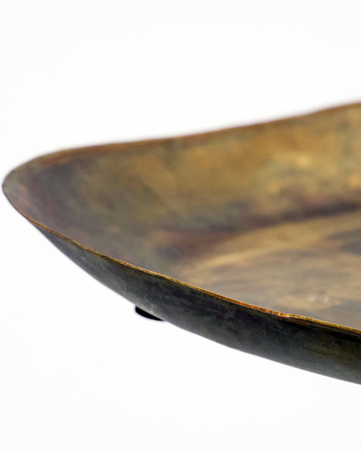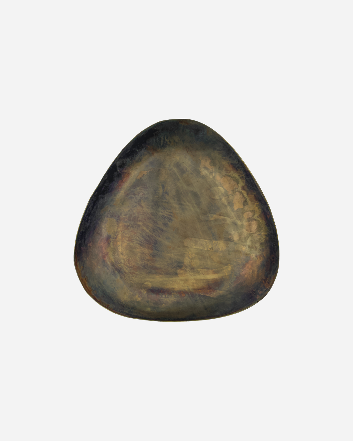 Tilføj et strejf af varme og karakter til din indretning med dette smukke jernfad i antik messingfinish. Den organiske form giver det et unikt og håndlavet udtryk, der gør det perfekt som dekorativt element, til bloklys eller som en elegant serveringsløsning til snacks.