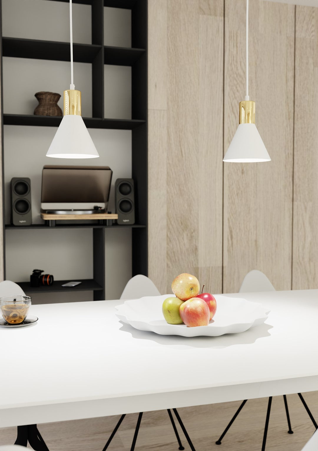 ROSA 1 Pendellampe – Hvid | Emibig er en elegant pendel, der kombinerer minimalistisk design med industrielle detaljer. Den koniske metalskærm i hvid giver lampen et let og stilrent udtryk, mens den gyldne inderside tilføjer varme og en sofistikeret kontrast.