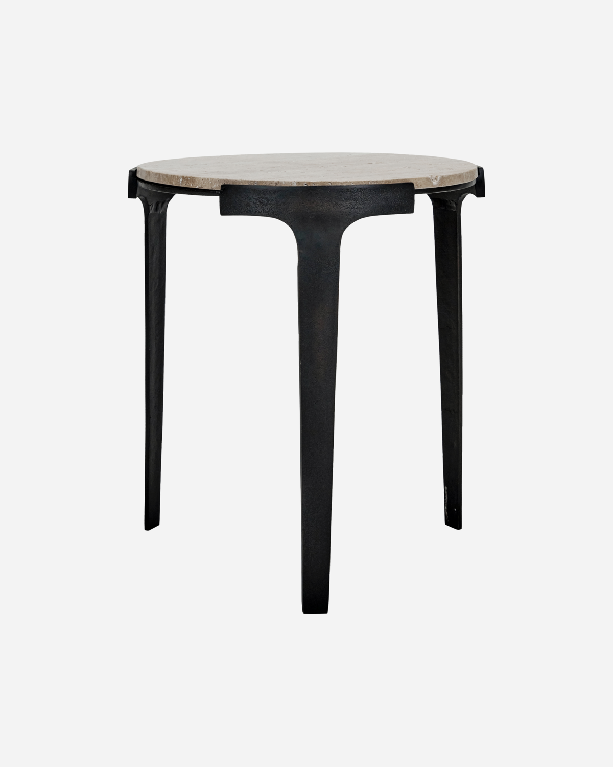 Forvandl din indretning med dette eksklusive sidebord, der forener rå naturmaterialer med moderne minimalisme. Bordpladen i smuk, grå travertin præsenterer unikke, naturlige mønstre, hvilket gør hvert bord til et ægte one-of-a-kind stykke. De slanke, sorte aluminiumsben skaber en elegant kontrast og sikrer et let og luftigt udtryk.