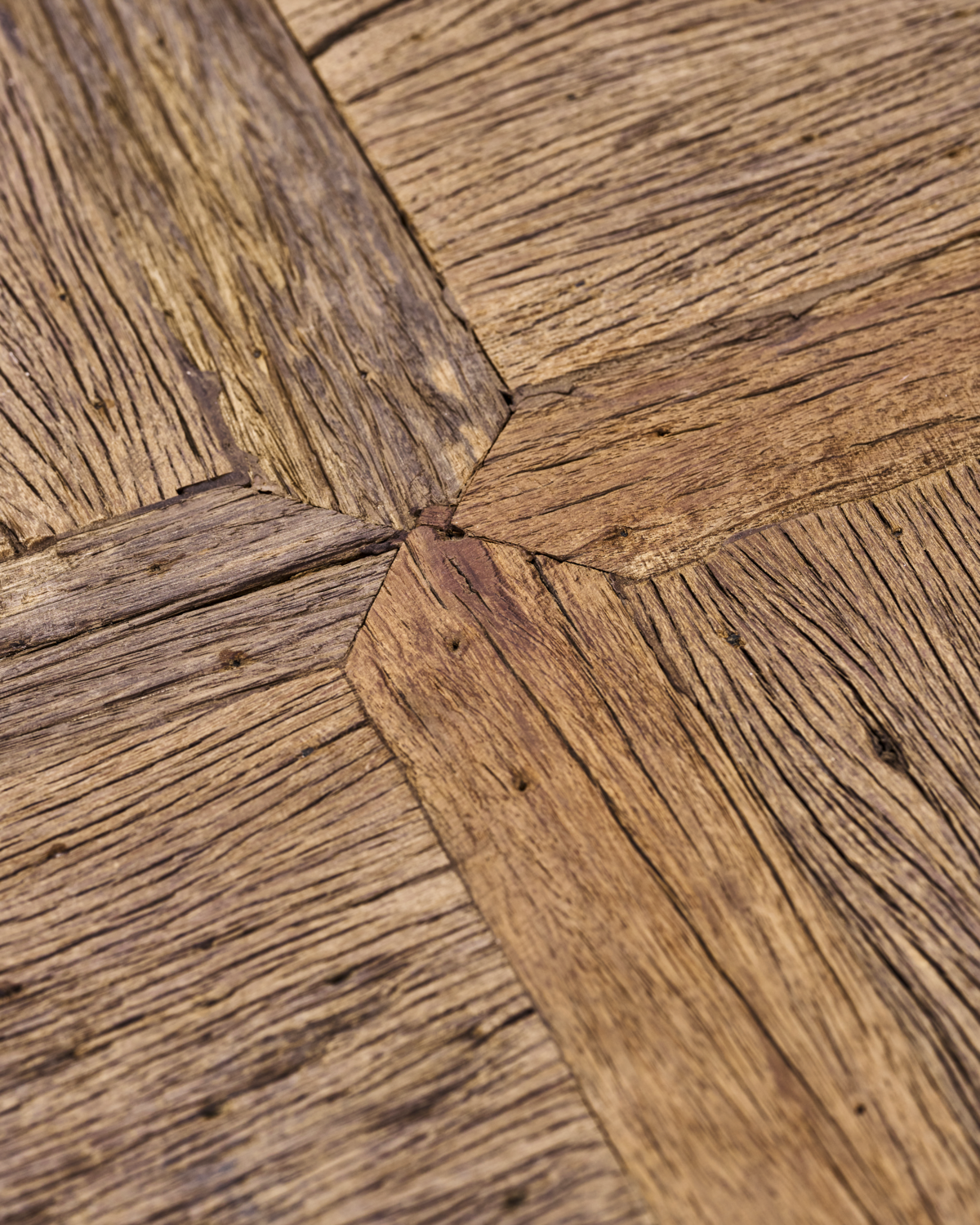 Giv din stue et løft med dette smukt udformede sofabord, der kombinerer klassisk elegance med bæredygtigt design. Fremstillet af en blanding af genbrugstræ og MDF, prydes bordets overflade af et iøjnefaldende mønster af træpaneler, der vidner om ægte håndværk og sans for detaljer.