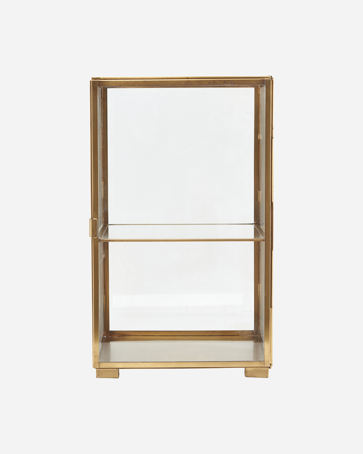 Montreet er designet med en let og luftig konstruktion i glas, omkranset af et elegant messingstel, der tilfører varme og eksklusivitet. Placer det i vindueskarmen, så sollyset får lov til at spille i glasset og fremhæve indholdet på smukkeste vis – eller brug det som dekorativt element på en reol, kommode eller et sidebord.